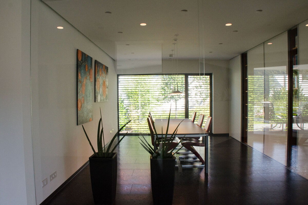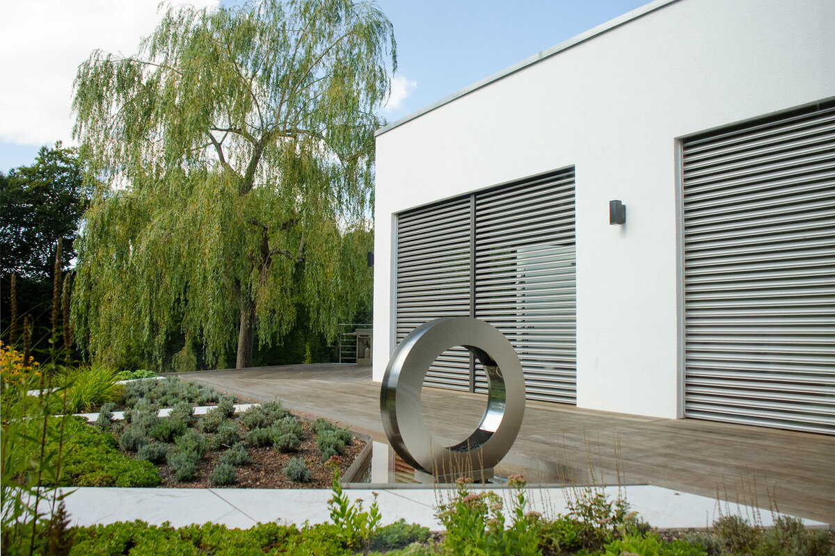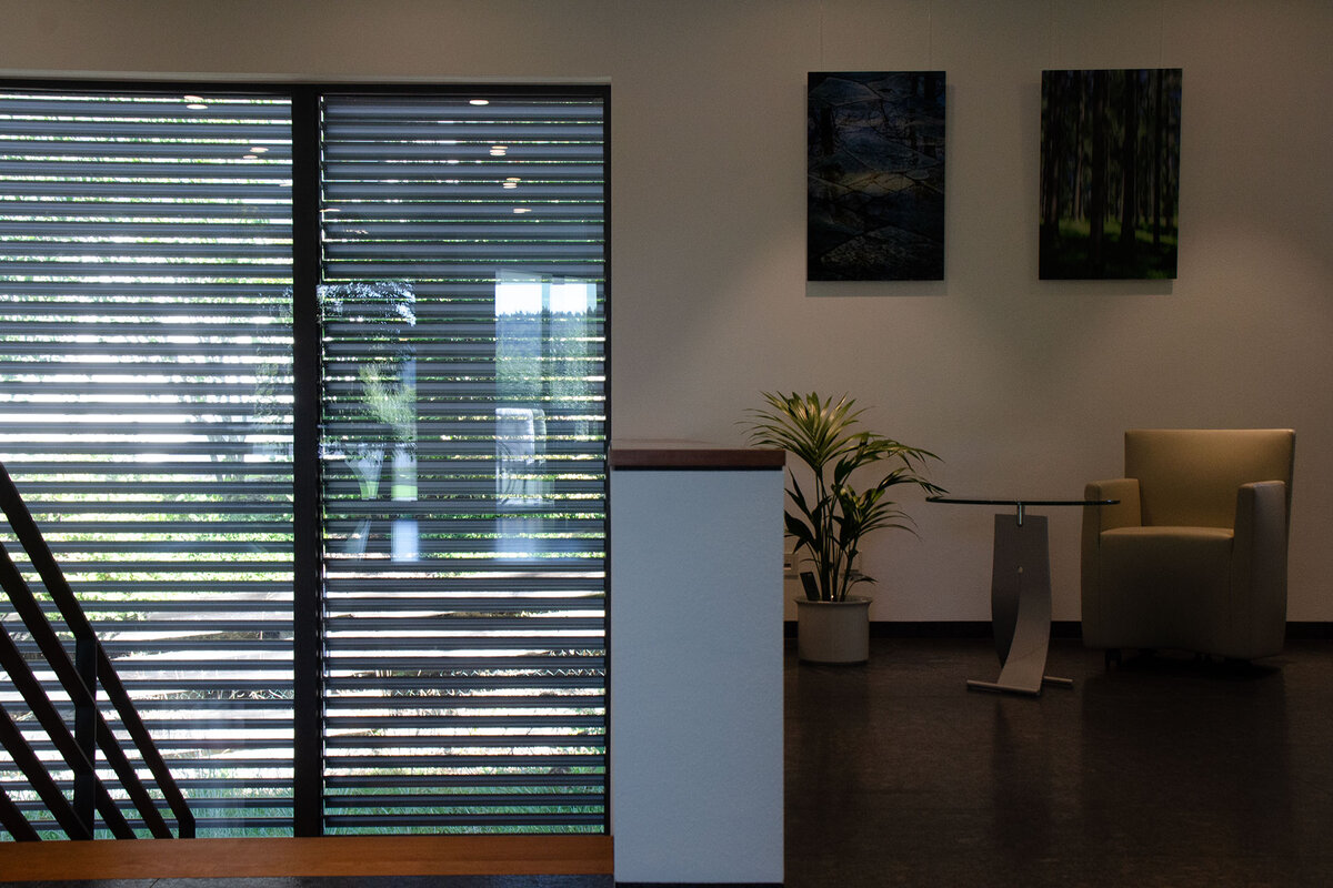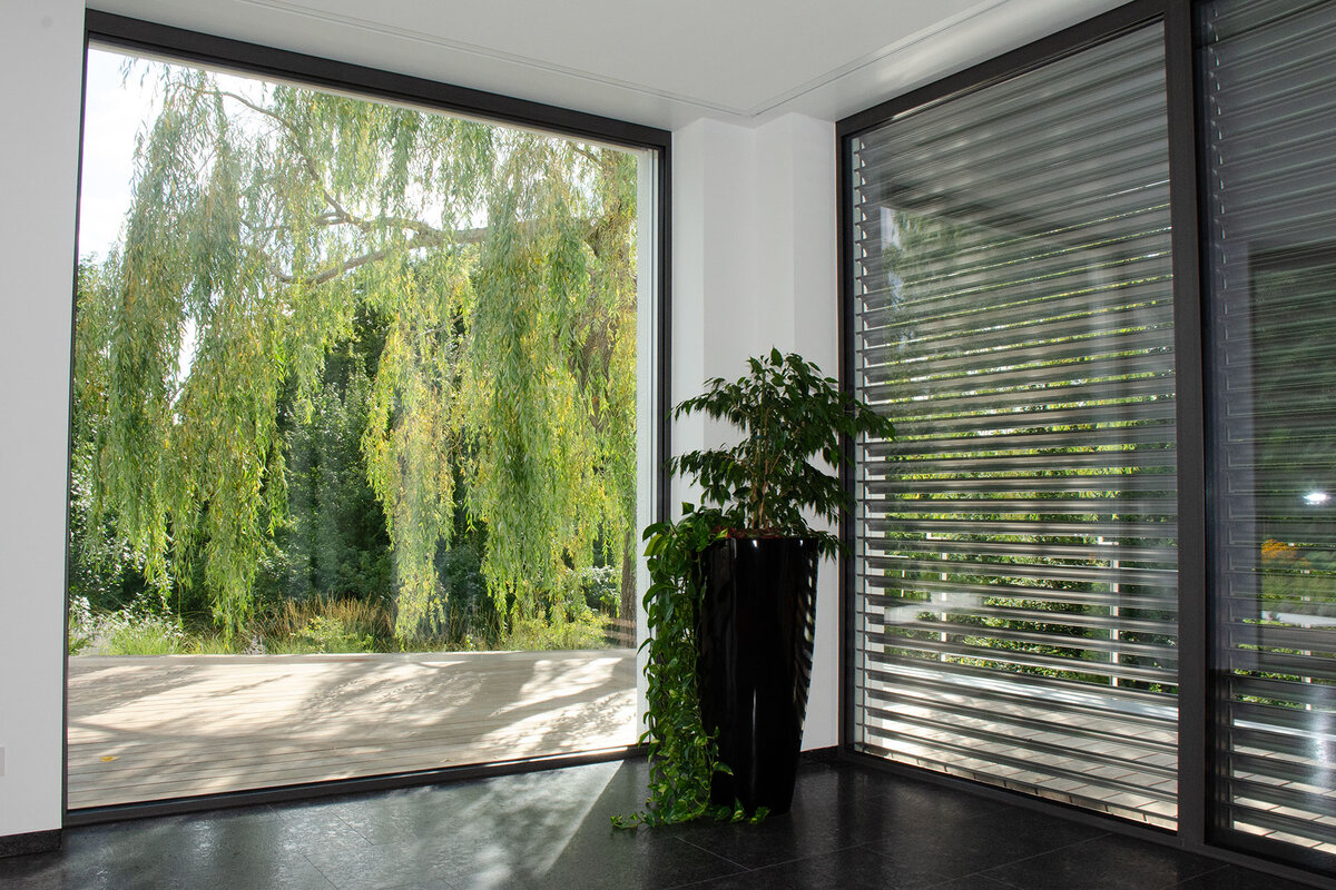 Schwenkbare Aluminium-Lamellen, die Tageslicht lenken und gleichzeitig für Sicht- und Sonnenschutz sorgen. Vor allem vor großen Fenstern und in transparenter Architektur wirksam – stilvoll und funktional.